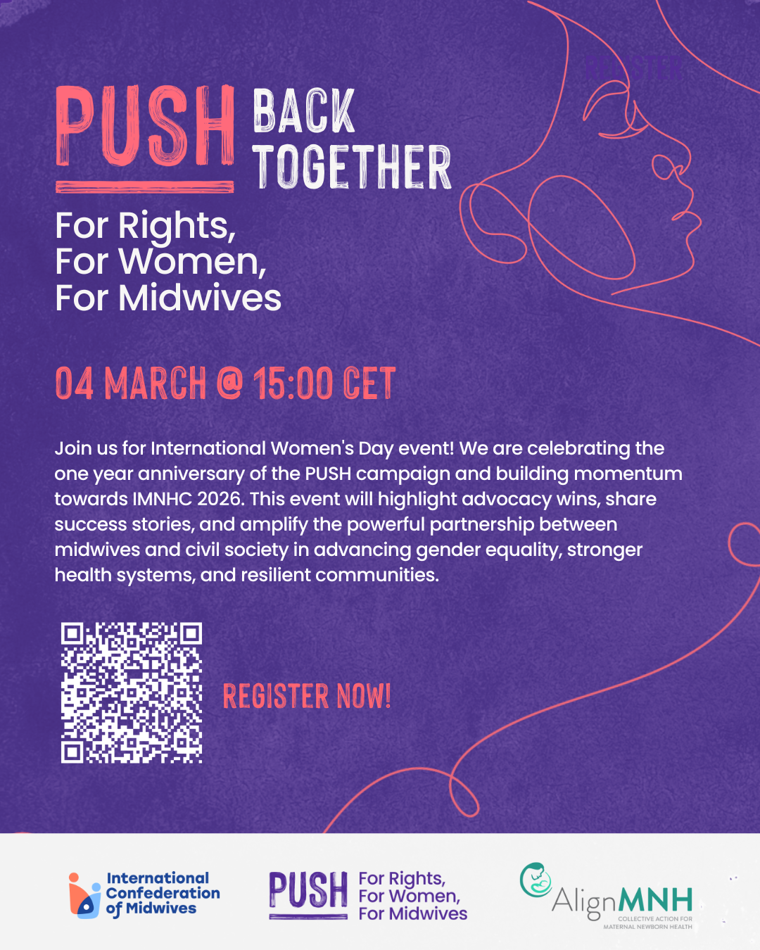 Join us for our International Women’s Day event! We are celebrating the one year anniversary of the PUSH campaign and building momentum towards IMNHC 2026 as we bring together midwives, advocates, and partners to PUSH back for rights, for women, and for midwives. The event will spotlight advocacy wins, share country success stories from ICM’s Regional Advocacy Incubator, and celebrate PUSH champions driving change.