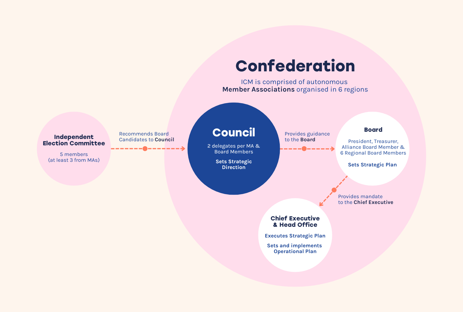 The ICM Council is the Confederation’s highest decision-making authority. The Council sets ICM’s strategic direction and provides a mandate to the Board. It should be noted that: